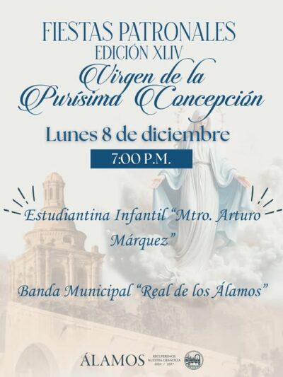El Ayuntamiento de Álamos invita a toda la comunidad a disfrutar la programación de este lunes 8 de diciembre, dentro de la Edición XLIV de las Fiestas Patronales en honor a la Virgen de la Purísima Concepción.