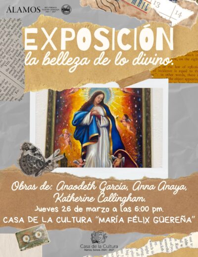 El Ayuntamiento de Álamos, en coordinación con la Casa de la Cultura “María Félix Güereña”, invita a la inauguración de la exposición en su galería temporal titulada “La Belleza de lo Divino”.