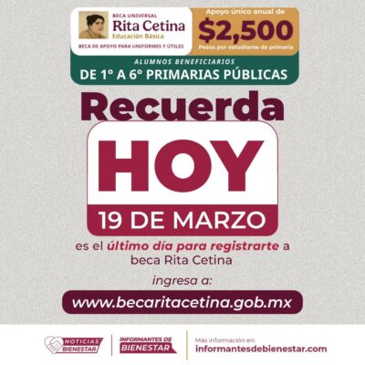 Hoy es el último día para que los alumnos de primaria pública de 1° a 6° grado se registren en la Beca Universal Rita Cetina, que otorga un apoyo ún