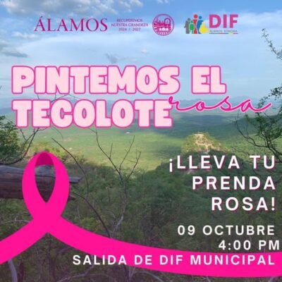 El H. Ayuntamiento de Álamos hace una invitación especial a la comunidad para participar en la emotiva iniciativa “Pintemos el Tecolote de Rosa”, un evento dedicado a la reflexión, el apoyo y la unión en torno a quienes enfrentan con valentía una de las luchas más significativas de la vida.