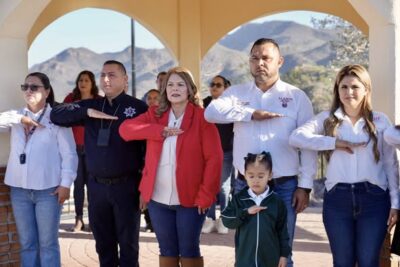 El Presidente Municipal, Prof. Samuel Borbón Lara, encabezó la ceremonia cívica con motivo del Día de la Bandera, símbolo nacional junto con el Escudo y el Himno Nacional. Fue acompañado por su esposa, la presidenta del DIF municipal, Mtra. Patricia Valenzuela Morales.