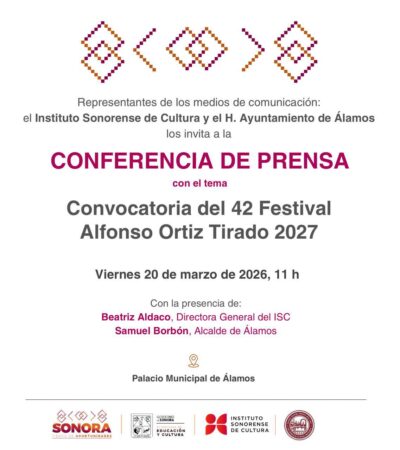 El Instituto Sonorense de Cultura y el Ayuntamiento de Álamos invitan a artistas locales y medios de comunicación a la conferencia de prensa que se realizará mañana a las 11:00 a.m. en la explanada del Palacio Municipal.