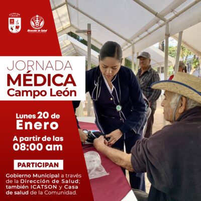 Este lunes 20 de enero a partir de las 08:00 am, en las instalaciones de la Casa de Salud, de la comunidad de Campo León, se estará llevando a cabo una Jornada Médica. Participan el Gobierno Municipal de Etchojoa a través de la Dirección de Salud, ICATSON y personal de la Casa de Salud.