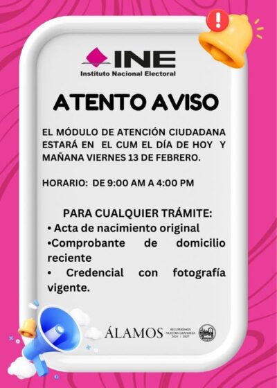 Atención ciudadanía de Álamos . Atenta invitación para acudir al módulo del INE, que estará instalado en Palacio Municipal hoy día 12 de febrero y mañana 13 de febrero en un horario de 9:00 a.m. a 4:00 p.m. ¡ . Aprovecha esta oportunidad y realiza tu trámite a tiempo!