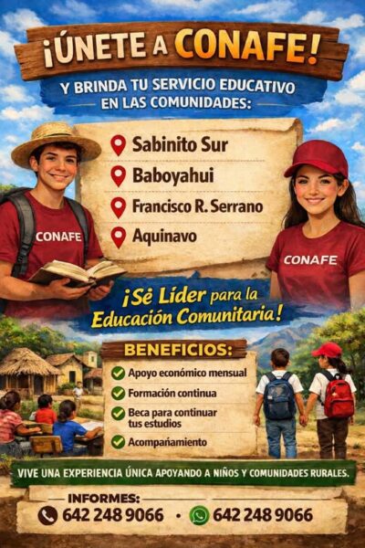 ¡ÚNETE A CONAFE! . Brinda servicio educativo en comunidades y sé parte de un cambio que puede transformar vidas. . Recibe apoyo económico mensual, formación continua y la oportunidad de obtener una beca para continuar tus estudios. . Sabinito Sur | Baboyahui | Francisco R. Serrano | Aquinavo . Informes: 642 248 9066