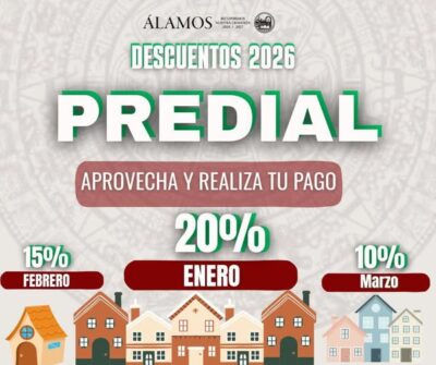 Cumplir también tiene beneficios. . Aprovecha los descuentos por pronto pago y contribuye al desarrollo de nuestro municipio. 20% en enero 15% en febrero 10% en marzo . Realiza tu pago a tiempo y forma parte del fortalecimiento de los servicios y obras para Álamos.