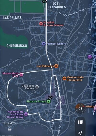 Posteriormente, el recorrido sigue a la izquierda por Hacienda de Los Santos y luego a la derecha rumbo al IMSS. Se toma a la izquierda frente a Casa Corazón y se gira nuevamente a la izquierda por el expendio Lucero.