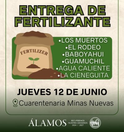 El H. Ayuntamiento de Álamos informa a los productores del municipio que ya se encuentra disponible el calendario oficial de entrega de Fertilizante