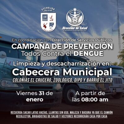 Este viernes 31 de enero a partir de las 08:00 am, el Gobierno Municipal en coordinación con la Dirección de Salud y Dirección de Servicios Públicos, realizarán recorridos en las colonias El Crucero, Zoológico, Dipo y Barrio El Jito de la Cabecera Municipal, para llevar a cabo la Campaña de Limpieza y Descacharrización “Todos contra el Dengue”.