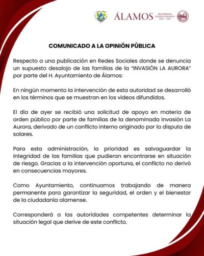 El H. Ayuntamiento de Álamos emitió un comunicado dirigido a la opinión pública para aclarar versiones difundidas en redes sociales sobre un supuesto desalojo de familias del asentamiento conocido como “Invasión La Aurora”.