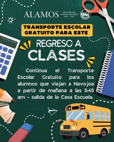 Con motivo del regreso a clases, el servicio de transporte escolar gratuito continúa en operación para apoyar a las y los alumnos que diariamente se trasladan de Álamos a Navojoa.