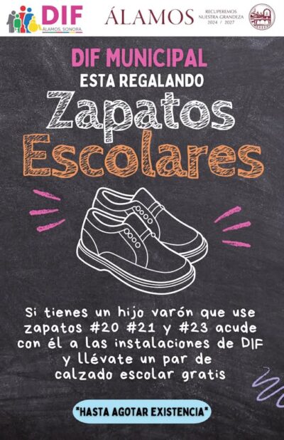 on el objetivo de apoyar la economía familiar ante el próximo regreso a clases, el Sistema DIF Municipal de Álamos ha lanzado una campaña especial de entrega gratuita de zapatos escolares para niños, en las tallas 20, 21 y 23.
