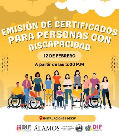 DIF Municipal invita a las personas con capacidades diferentes a realizar su trámite de emisión de certificado este 12 de febrero a partir de las 5:00 P.M.