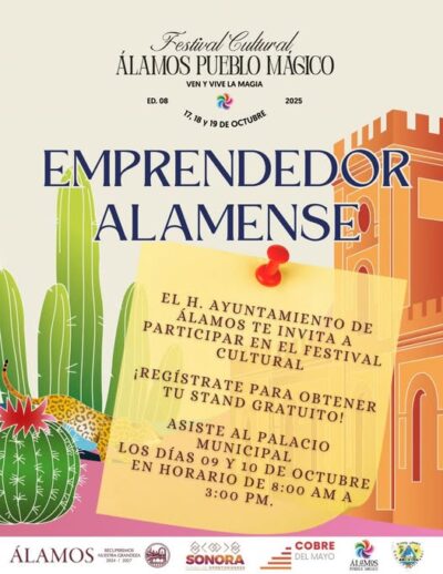 El H. Ayuntamiento de Álamos reafirma su compromiso con el impulso al emprendimiento local, invitando a las y los comerciantes del municipio a participar en el Festival Cultural Álamos Pueblo Mágico 2025 con un stand completamente gratuito.