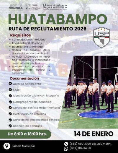 Las y los aspirantes deberán presentarse el próximo 14 de enero de 2026, en un horario de 8:00 a 18:00 horas, en el Palacio Municipal de Huatabampo, donde podrán realizar su registro y recibir información detallada sobre el proceso.