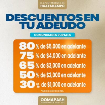 Con el objetivo de apoyar la economía familiar y fomentar la regularización de pagos, el Organismo Operador Municipal de Agua Potable, Alcantarillado y Saneamiento (OOMAPASH) lanzó un programa de descuentos dirigido a usuarios de comunidades rurales que presentan adeudos en el servicio.