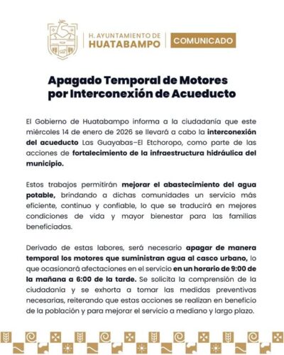 El Gobierno Municipal de Huatabampo informó que este miércoles 14 de enero de 2026 se llevarán a cabo trabajos de interconexión del Acueducto Los Gu