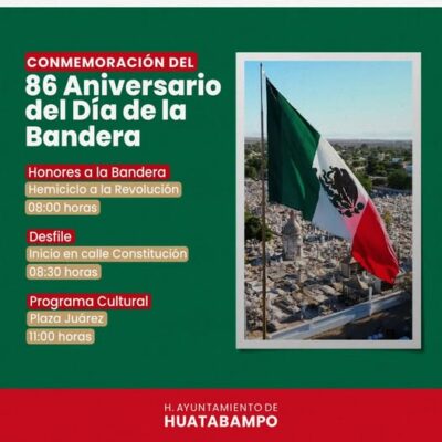 Autoridades municipales invitaron a la ciudadanía a participar en la conmemoración del 86 aniversario del Día de la Bandera, que se llevará a cabo con una serie de actividades cívicas este lunes.