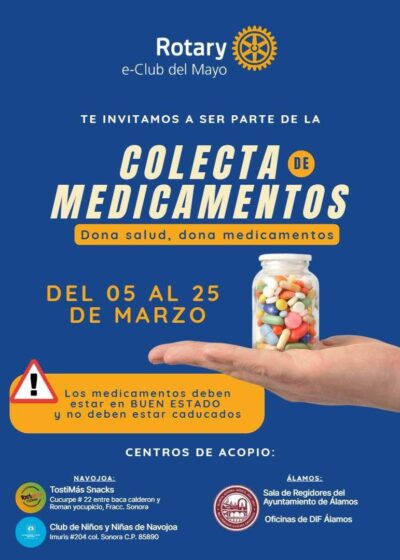 El Ayuntamiento de Álamos invita a la ciudadanía a sumarse al acopio de medicamentos en apoyo al Rotary e-Club del Mayo, una iniciativa solidaria que busca beneficiar a quienes más lo necesitan.