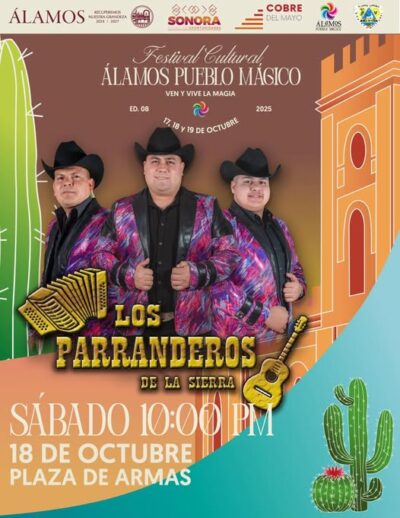 La fiesta y la buena música se harán sentir en el corazón de Álamos este sábado 18 de octubre, cuando la agrupación “Los Parranderos de la Sierra” se presente en la Plaza de Armas como parte del Festival Cultural Álamos Pueblo Mágico 2025.
