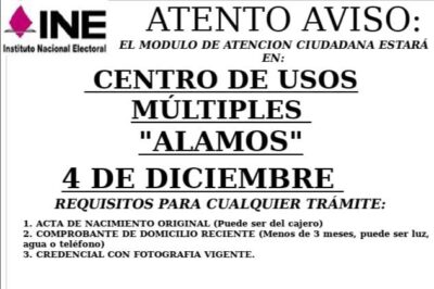 El Ayuntamiento de Álamos informó que el módulo de Atención Ciudadana del INE estará disponible para la comunidad el próximo 4 de diciembre en las instalaciones del Centro de Usos Múltiples (CUM).