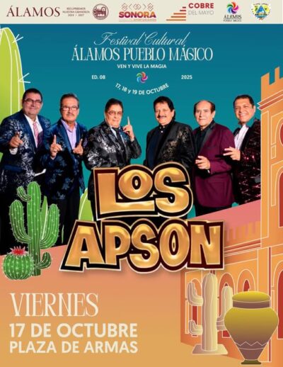 El Festival Cultural Álamos Pueblo Mágico te invita a disfrutar de una noche inolvidable con la presentación estelar de la legendaria agrupación Los Apson.