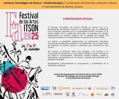 El H. Ayuntamiento de Álamos informó que las actividades del Festival de las Artes ITSON – SubSede Álamos programadas para espacios públicos han sido canceladas, esto en señal de solidaridad por los hechos ocurridos recientemente en Hermosillo, en una tienda comercial.